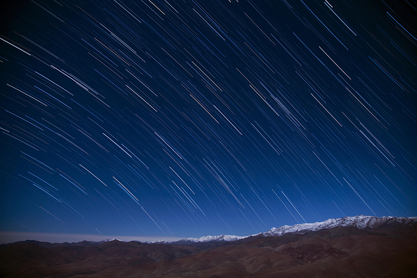 Star trails over the Atacama desert in Chile as seen from La Silla. Snow covers the distant mountain tops, and soft clouds can be seen near the horizon to the left.