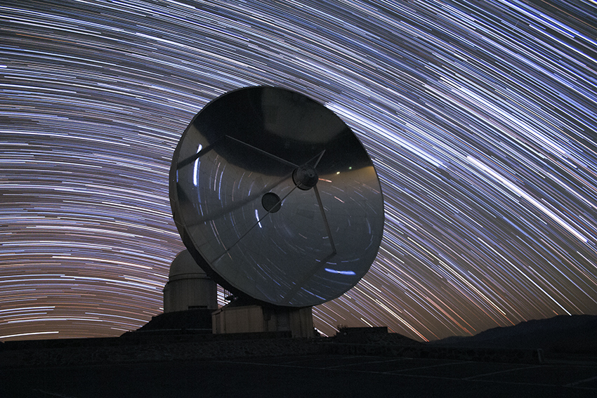 The Swedish-ESO Submillimetre Telescope (SEST) and startrails. The stars in the lower left rotate around the northern pole, while the stars reflected in the dish rotate around the southern pole